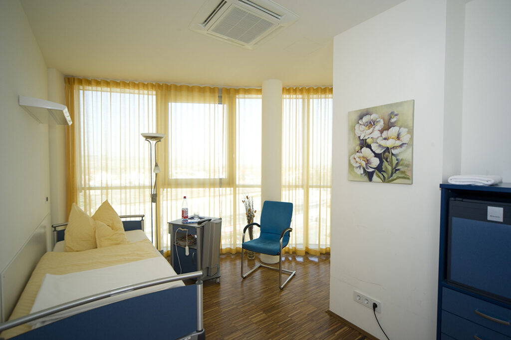 A pleasant, personal feel-good atmosphere awaits you at the Rheinclinic. If you are planning an inpatient operation, you can relax in our bright and friendly rooms with a high level of comfort. The Rheinclinic has 10 comfortable patient beds. In addition, free digital TV, WLAN Internet, air conditioning and a fridge are available, as well as room-related showers and toilets. From the rooms you have a breathtaking view of the vineyards, the Rhine plain and on a clear day you can enjoy the far-reaching view of the Taunus, the skyscrapers of Frankfurt and the Odenwald.