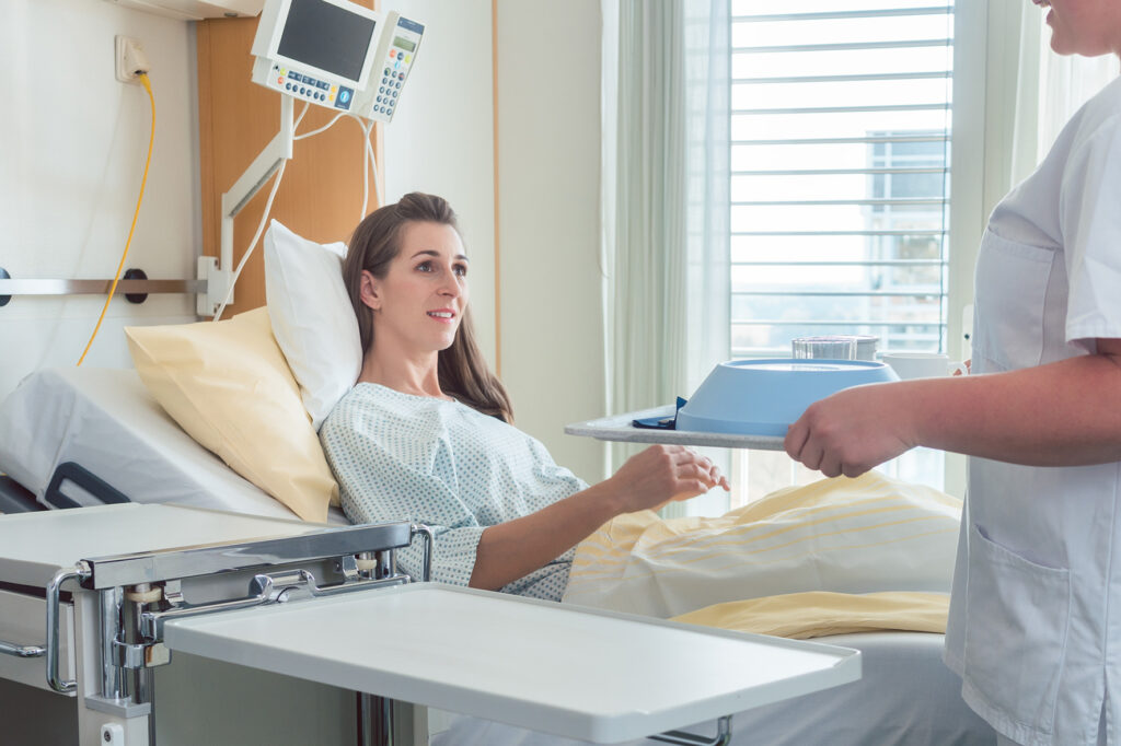 During an inpatient stay at the Rheinclinic, we naturally attach great importance to ensuring that you enjoy a healthy diet so that your body can regenerate quickly. For this reason, we take great care to ensure that the dishes are prepared using high-quality ingredients. If you have a vegetarian diet, we will be happy to take this into account. We are happy to cater for other special dietary requirements or illnesses or intolerances as far as possible. However, we ask for your understanding if this is not always possible. Please contact us before the start of your inpatient stay. Drinks (mineral water, juices, various teas or coffee) and fresh seasonal fruit are available to you free of charge day and night.